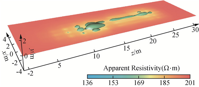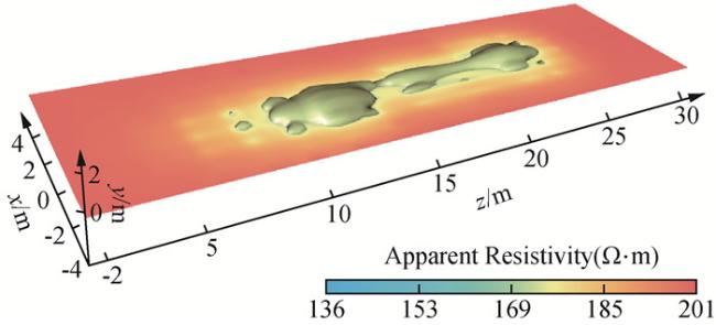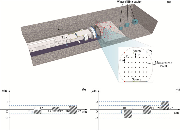 图1 TBM隧道环境下,多辐射源的探测过程示意图(a)辐射源布置方式与含水溶洞结构示意图;(b)含水溶洞模型体俯视图;(c)含水溶洞模型体侧视图. Fig 1 Schematic diagram of the prospecting process of a multi-source with galvanic sources in a TBM tunnel environment (a) Schematic diagram of source layout and water-bearing cave model; (b) Top view of the water-bearing cave model; (c) Side view of the water-bearing cave model. |