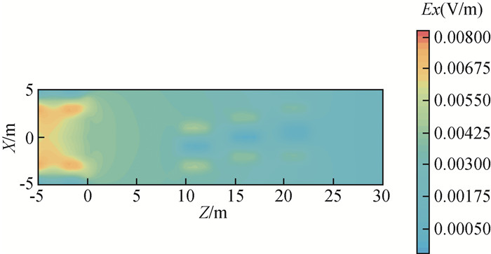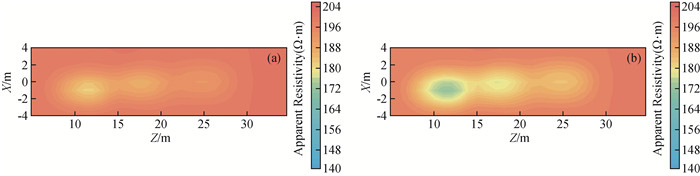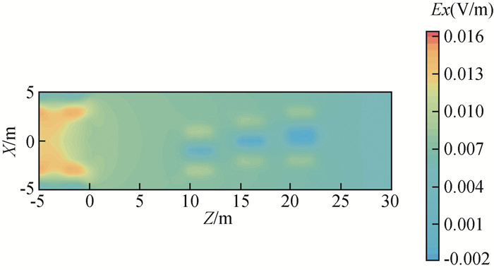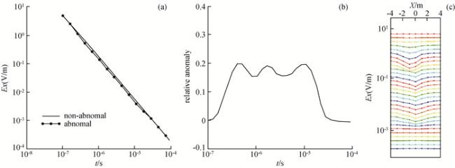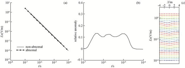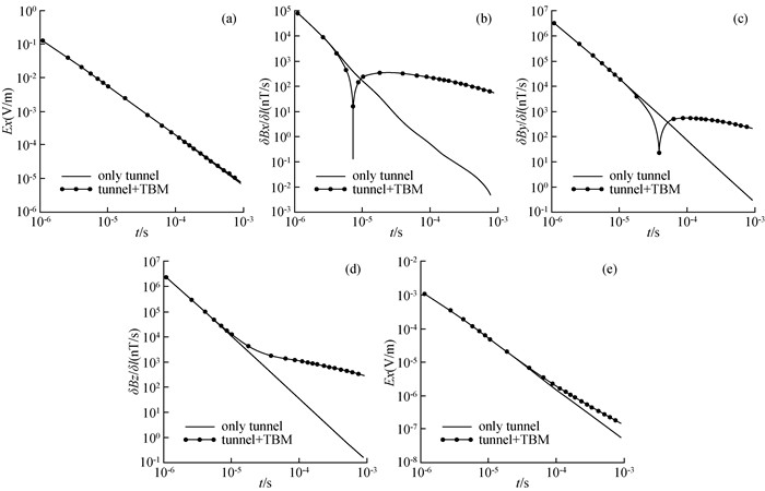 图2 TBM环境下与无TBM环境下,电场和磁场各分量二次场衰减曲线对比(a)电场x分量衰减曲线对比;(b)磁场x分量衰减曲线对比;(c)磁场y分量衰减曲线对比;(d)磁场z分量衰减曲线对比;(e)电场y分量衰减曲线对比. Fig 2 Comparison of the secondary field attenuation curves of each component of the electrical and magnetic fields in a TBM environment and in an environment without TBM (a) x component of the electrical field; (b) x component of the magnetic field; (c) y component of the magnetic field; (d) z component of the magnetic field; (e) y component of the electrical field. |