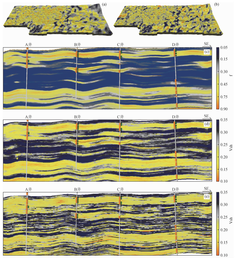 图3 王窑南地区地震岩性概率体约束岩相模型及随机模拟岩相模型建模结果(a)地震约束岩相模型立体图;(b)离散随机模拟岩相模型立体图;(c)地震岩性概率体剖面图;(d)地震约束岩相模型剖面图;(e)离散随机模拟岩相模型剖面图. Fig 3 Seismic-constrained rock phase model and discrete stochastic simulated rock phase model in south Wangyao block (a)Seismic-constrained rock phase model; (b) Discrete stochastic simulated rock phase model; (c) Seismic lithologic probability profile map; (d) Seismic-constrained rock phase model profile map; (e) Discrete stochastic simulated rock phase model profile map. |