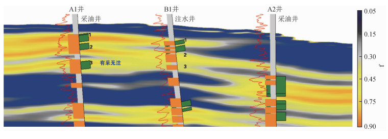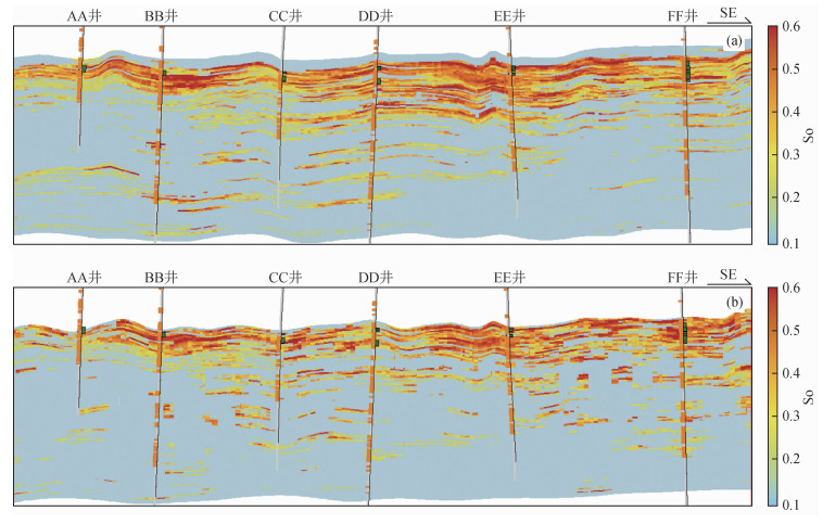 图5 王窑南地区地震约束含油饱和度模型剖面及离散随机模拟含油饱和度模型(a)地震约束饱和度模型剖面;(b)离散随机模拟饱和度模型. Fig 5 The profile map for seismic constraint oil saturation model profile and discrete stochastic simulated oil saturation model in south Wangyao block (a) Seismic-constrained oil-saturation model profile map; (b) Discrete stochastic simulated oil-saturation model profile map. |