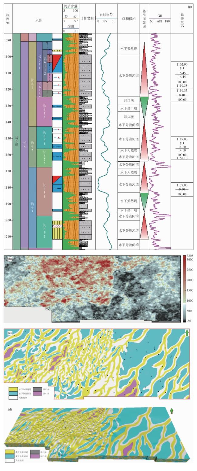 图2 井震结合刻画单砂体沉积微相(a)王窑南地区桥AA单井沉积相图;(b)王窑南地区长6层地震平均振动能量属性平面图; (c)王窑南地区长61121层沉积微相平面图; (d)王窑南地区长6段沉积微相模型图. Fig 2 Combining well seismic analysis to characterize sedimentary microfacies of single sand bodies (a)The phase diagram of Qiao AA in south Wangyao block; (b) The average vibration energy seismic attribution of chang6 reservoir in south Wangyao block; (c) The sedimentary facies plan of chang61121 reservoir in south Wangyao block; (d) The sedimentary facies model of chang6 reservoir in south Wangyao block. |