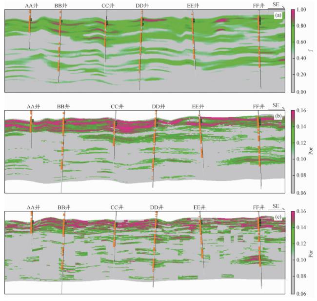图4 王窑南地区地震孔隙度反演体约束孔隙度模型及离散随机模拟孔隙度模型剖面结果(a)地震孔隙度反演体剖面;(b)地震约束孔隙度模型剖面;(c)离散随机模拟孔隙度模型剖面. Fig 4 The profile map for seismic-constrained porosity model and discrete stochastic simulated porosity model in south Wangyao block (a) Seismic porosity inversion volume profile map; (b) Seismic-constrained porosity model profile map; (c) Discrete stochastic simulated porosity model profile map. |