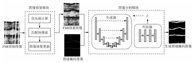 In the process of reservoir drilling and development, it is of great significance to accurately extract, identify and evaluate the fractures in the formation to guide the drilling and development of oil and gas exploration. To solve the problem of imprecise fracture region segmentation by traditional methods, a fracture segmentation method based on Formation Micro-Scanner Image based on deep learning is proposed. Firstly, F-Criminisi algorithm is used to repair the blank strip with missing pixel information in the original FMI logging image. Then, a generative adversus-network based on U-Net is constructed, and dual attention mechanism is introduced to construct a fracture segmentation model to achieve accurate fracture segmentation under complex background. Combining pixel and edge information, loss function is designed to enable the model to more accurately segment the fracture and background region in the logging image and make the fracture boundary in the segmentation result clearer. In this paper, the proposed model is tested by using real FMI logging image of carbonate reservoir. The results show that the Dice coefficient of the proposed fracture segmentation method is 5% higher than that of the classical fracture segmentation model U-Net. This method can accurately extract fracture information from FMI logging images, and provides a basis for subsequent quantitative calculation of fracture parameters and logging interpretation, and has good practicability.