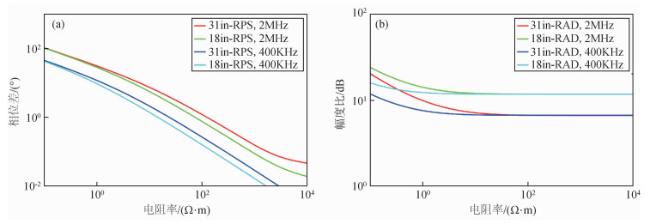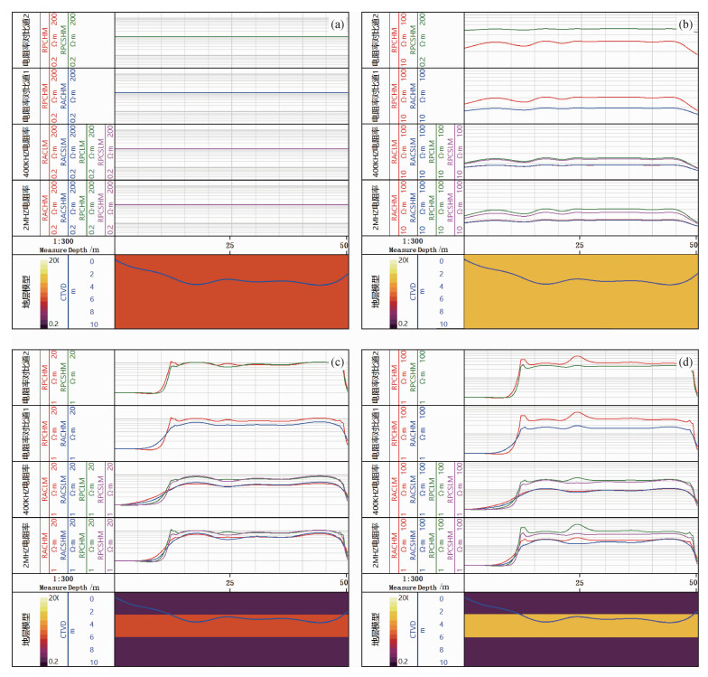 图3 不同环境条件下随钻电磁波电阻率测井响应对比(a)Rh=10 Ω · m, Rv=10 Ω · m;(b)Rh=10 Ω · m, Rv=50 Ω · m;(c)Rs=2 Ω · m, Middle layer Rh=Rv=10 Ω · m;(d)Rs=2 Ω · m, Middle layer Rh=10 Ω · m, Rv=50 Ω · m. Fig 3 Comparison of electromagnetic wave resistivity response of LWD under different environmental conditions |