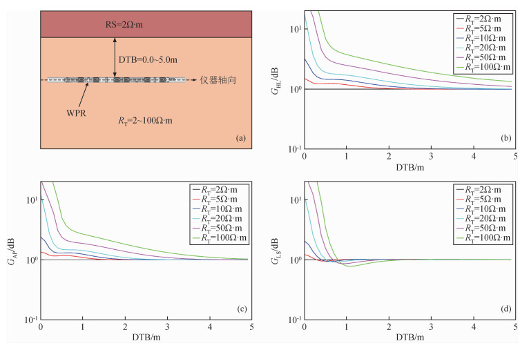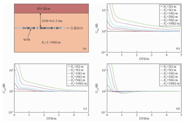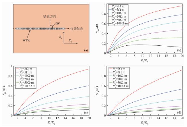 图4 各向异性指示信号随各向异性系数-电阻率变化(a)水平井地层模型示意图(各向异性Rv>Rh);(b)特征信号SAP随地层各向异性变化;(c) 特征信号SHL随地层各向异性变化;(d)特征信号SLS随地层各向异性变化. Fig 4 Anisotropy indicator signal changes with anisotropy coefficient resistivity (a)Horizontal well formation model (anisotropy Rv>Rh); (b)Feature signals SAP vary with layer anisotropy; (c)Feature signals SHL vary with layer anisotropy; (d)Feature signals SLS vary with layer anisotropy. |