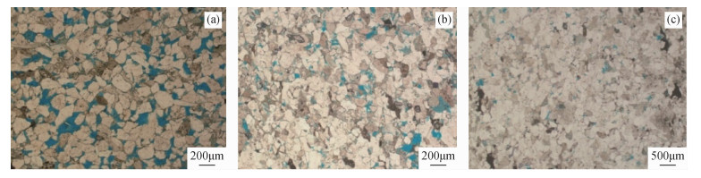图1 储层与非储层岩心照片(a)第一类储层岩心照片表现为中压实成岩相,颗粒之间以点接触为主;(b)第二类储层岩心照片,相较于(a)压实程度更强,保留了部分原生孔隙及部分溶蚀孔隙,矿物颗粒之间少量以点接触大量为线接触;(c)非储层对应岩心照片,岩石孔隙以溶蚀孔隙为主,强压实成岩相,颗粒之间以线接触或凹凸接触为主. Fig 1 Reservoir and non-reservoir core photographs (a) The first type of reservoir core photos exhibit a medium-pressure compacted lithification phase, with mainly point contacts between the particles; (b) The second type of reservoir core photos, compared to (a), show a higher degree of compaction, preserving some primary pores and partial dissolution pores, with a small amount of point contacts between mineral particles and a significant amount of line contacts; (c) The corresponding core photos of non-reservoir rocks display primarily dissolution pores, strong compaction lithification, and line or concave-convex contacts between particles. |