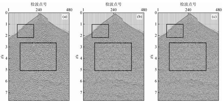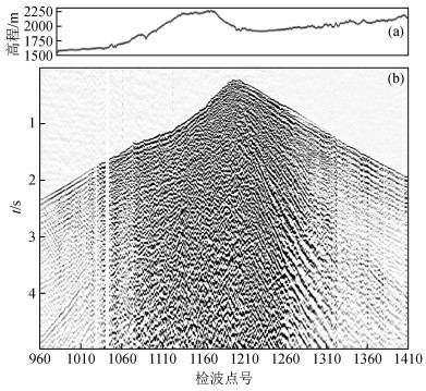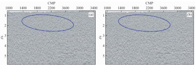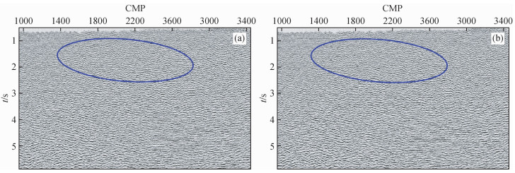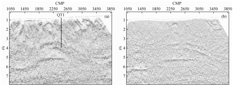 图9 山体区应用不同基距横向组合接收层析反演静校正量后的叠加剖面对比(a)应用横向5道组合(组合基距120 m)初至层析反演静校正量后的叠加剖面;(b)应用单道(组合基距5 m)初至层析反演静校正量后的叠加剖面. Fig 9 Comparison of the stack sections after static correction by different crossline geophone array length on the mountainous area (a) Stack section after static correction by tomography with crossline geophone array length of 120 m; (b) Stack section after static correction by tomography with crossline geophone array length of 5 m. |