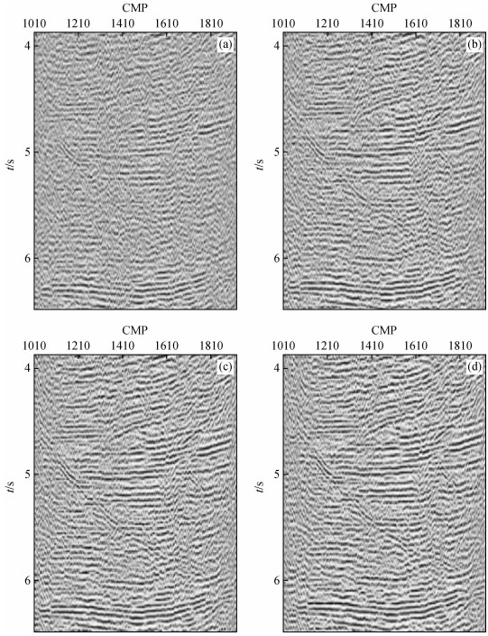 图4 工区以往宽线不同覆盖次数叠加剖面对比(a)1炮1线,覆盖次数120次;(b)1炮2线,覆盖次数240次;(c)2炮2线,覆盖次数480次;(d)3炮2线,覆盖次数720次. Fig 4 Comparison of the stack sections by previous wide-line seismic with different fold (a) 1 shot line and 1 receiver line, fold 120;(b) 1 shot line and 2 receiver lines, fold 240; (c) 2 shot lines and 2 receiver lines, fold 480; (d) 3 shot lines and 2 receiver lines, fold 720. |