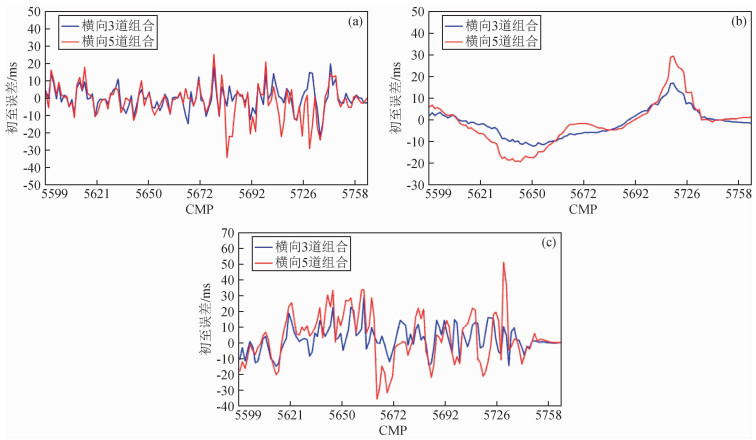 图7 山体区横向不同基距组合接收对层析速度反演和静校正量计算的影响(a)初至时间误差;(b)层析反演高速层顶面深度误差;(c)静校正量误差. Fig 7 Effects of different crossline geophone array length on the velocity tomography and static calculation (a) First arrival time error; (b) Depth error of the top of the high-velocity-layer by velocity tomography; (c) Statics error. |