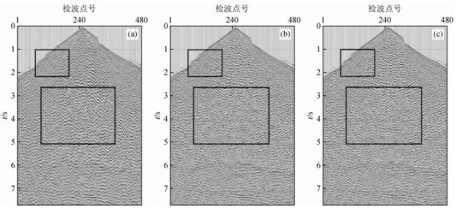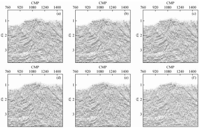 图11 不同炮道密度叠前时间偏移剖面对比(a)炮点距30 m,炮线距120 m;(b)炮点距60 m,炮线距120 m;(c)炮点距120 m,炮线距120 m;(d)炮点距60 m,炮线距360 m;(e)炮点距120 m,炮线距360 m;(f)炮点距30 m,炮线距360 m. Fig 11 Comparison of the pre-stack time migration sections with different trace density (a) Shot interval of 30 m, shot line interval of 120 m; (b) Shot interval of 60 m, shot line interval of 120 m; (c) Shot interval of 120 m, shot line interval of 120 m; (d) Shot interval of 60 m, shot line interval of 360 m; (e) Shot interval of 120 m, shot line interval of 360 m; (f) Shot interval of 30 m, shot line interval of 360 m. |