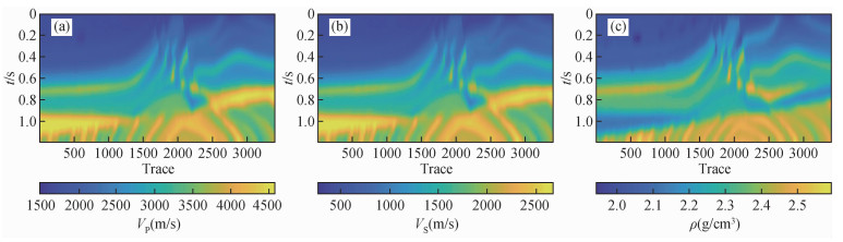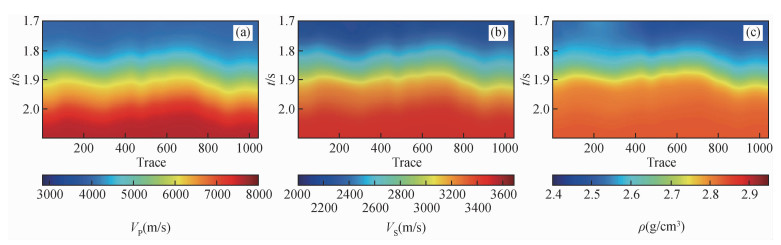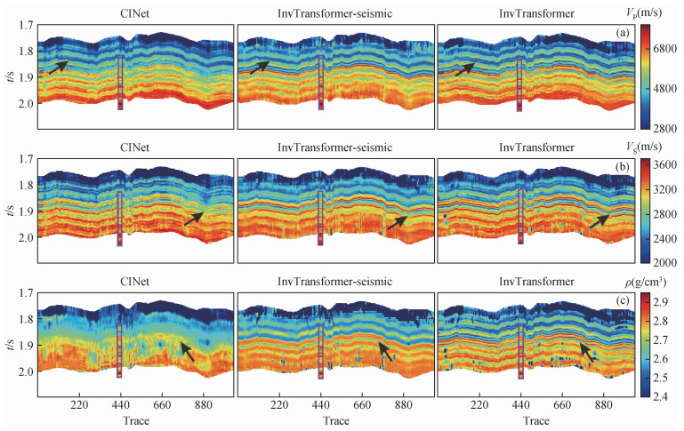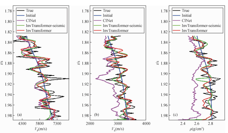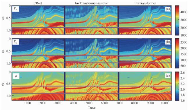 图11 三个网络在实际数据中的反演结果对比(a) 纵波速度;(b) 横波速度;(c) 密度. 每个子图从左到右分别为CINet、不含先验模型的InvTransformer和InvTransformer. Fig 11 The inversion results of the three networks in the field data (a) P-wave velocity; (b) S-wave velocity; (c) Density. Each subfigure is CINet, InvTransformer without prior model and InvTransformer from left to right. |