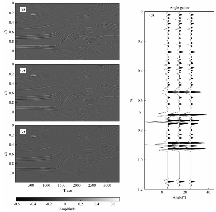 图3 Marmousi2模型合成叠前角道集记录(a)5°;(b)15°;(c)25°;(d)三个角度的角道集展示. Fig 3 Synthetic angle gathers of Marmousi2 model (a)5°; (b)15°; (c)25°; (d) The wiggle display of three angle gathers. |