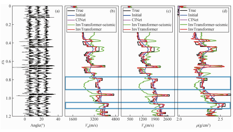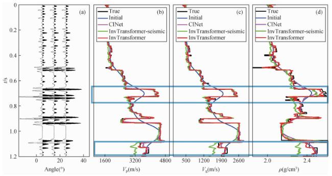 图8 三个网络在SNR=5 dB的合成数据中的反演结果(第1800道)对比(a)第1800道的角道集展示;(b)纵波速度;(c)横波速度;(d)密度.其中黑色、蓝色、粉红色、绿色和红色线条分别表示真实值、初始先验值、CINet、不含先验模型的InvTransformer和InvTransformer. Fig 8 The comparison results of the three networks in the synthetic data with SNR=5 dB(trace 1800) (a) The wiggle display of three angle gathers at trace 1800; (b) P-wave velocity; (c) S-wave velocity; (d) Density. The black, blue, pink, green and red lines represent the true value, the initial prior value, CINet, InvTransformer without initial prior value, and InvTransformer respectively. |