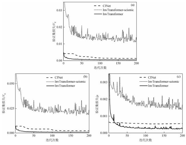 图6 不同网络训练过程中的验证集损失变化(a) 纵波速度;(b) 纵波横波;(c) 密度. Fig 6 Validation loss changes in different network training processes (a) P-wave velocity; (b) S-wave velocity; (c) Density. |