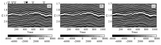 图9 实际叠前角道集叠加记录(a) 0°~10°的倾角叠加;(b) 10°~20°的倾角叠加;(c)20°~30°的倾角叠加. Fig 9 Field stacked angle gathers (a) Angle stacks of 0°~10°; (b) Angle stacks of 10°~20°; (c) Angle stacks of 20°~30°. |