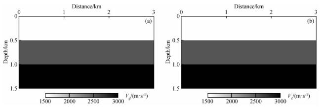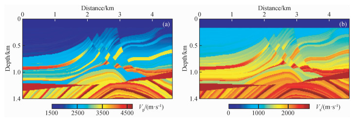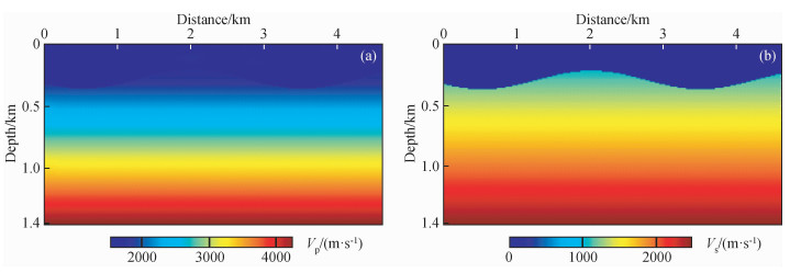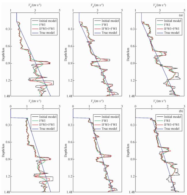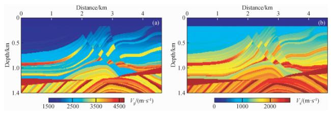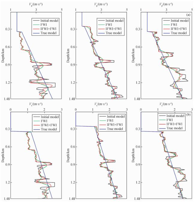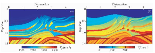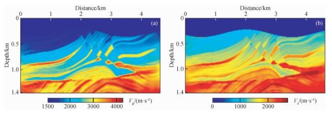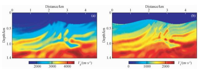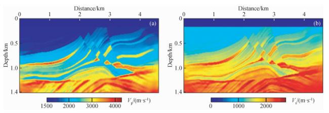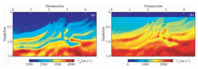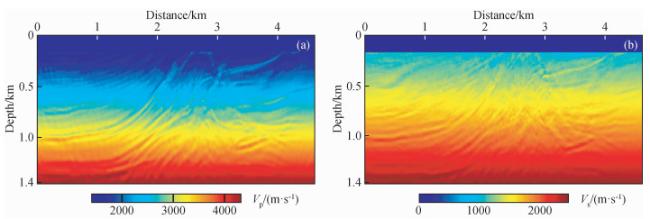 图8 时间二阶积分波场+全波形反演(IntI2+FWI)结果(a)反演纵波速度;(b)反演横波速度. Fig 8 The second-order time integral wavefield+full waveform inversion (IntI2+FWI) results (a) Inverted P-wave velocity; (b) Inverted S-wave velocity. |