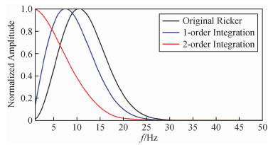 图2 Ricker子波及其时间积分的频谱(主频为10 Hz)黑线为Ricker子波的频谱;蓝线为Ricker子波时间一阶积分的频谱;红线为Ricker子波时间二阶积分的频谱. Fig 2 The frequency spectrum of a Ricker wavelet with a dominant frequency of 10 Hz and its time integral The black line represents the spectrum of the Ricker wavelet, the blue line denotes the spectrum of first-order time integral of ricker wavelet, the red line denotes the spectrum of second-order time integral of ricker wavelet. |
