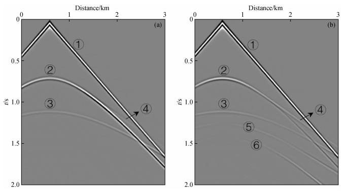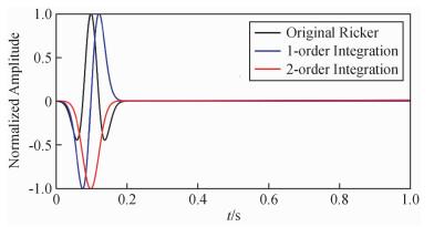 图1 Ricker子波及其时间积分(主频为10 Hz)黑线为Ricker子波;蓝线为Ricker子波的时间一阶积分;红线为Ricker子波的时间二阶积分. Fig 1 Ricker wavelet with a dominant frequency of 10 Hz and its time integral The black line represents the Ricker wavelet, the blue line denotes the first-order time integral of Ricker wavelet and the red line denotes the second-order time integral of the Ricker wavelet. |