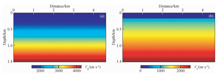 图7 时间二阶积分波场全波形反演结果(a)反演纵波速度;(b)反演横波速度. Fig 7 The inversion results by full waveform inversion of the second-order time integral wavefield (a) Inverted S-wave velocity; (b) Inverted S-wave velocity. |