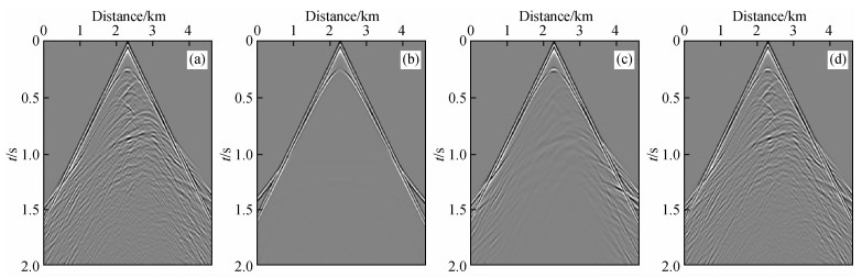 图9 地震记录(a)观测记录;(b)初始模型模拟记录;(c)积分波场反演记录;(d)积分波场+全波形反演记录. Fig 9 Seismic records (a) Observed data; (b) Record calculated using initial model; (c) Record calculated using integral wavefield; (d) Record calculated final inverted model. |