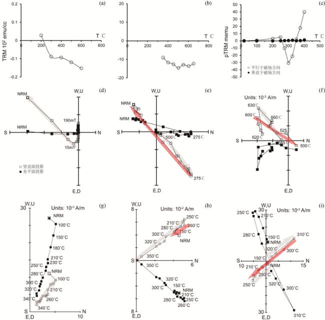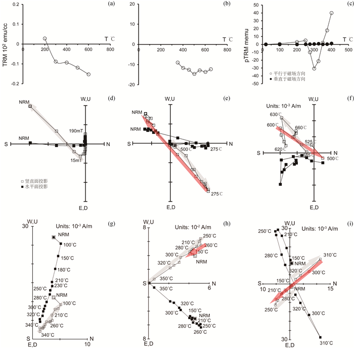图1 地质样品天然剩磁自反转典型研究案例(a,b)日本榛名山英安岩和从中提取出的钛赤铁矿在实验室均获得自反转TRM(修改自Nagata et al., 1952);(c—e)西北太平洋枕状玄武岩的部分热剩磁实验结果、交变退磁曲线和热退磁曲线(修改自Doubrovine and Tarduno, 2004);(f)广西大梅红壤层黏土样品的热退磁结果(修改自Liu et al., 2022);(g—i)单极性、过渡极性和多极性铁硫化物沉积物的热退磁结果(修改自Chang et al., 2023).灰色剪头指示原始剩磁分量,红色箭头指示自反转分量. Fig 1 Representative case studies of self-reversed NRM in geological samples (a, b) Self-reversed TRM obtained by both Haruna dacite and extracted titanohematite in laboratory (modified from Nagata et al., 1952); (c—e) Partial-TRM results, alternating field demagnetization curves, and thermal demagnetization curves of pillow basalt samples from the Northwest Pacific (modified from Doubrovine and Tarduno, 2004); (f) Thermal demagnetization results of clay samples from the Damei red soil sequence in southern China (modified from Liu et al., 2022); (g—i) Thermal demagnetization results of single-polarity, transitional-polarity, and multi-polarity iron sulfide sediment samples (modified from Chang et al., 2023). Gray arrows indicate the primary remanent magnetization components, while red arrows denote the self-reversed components. |
