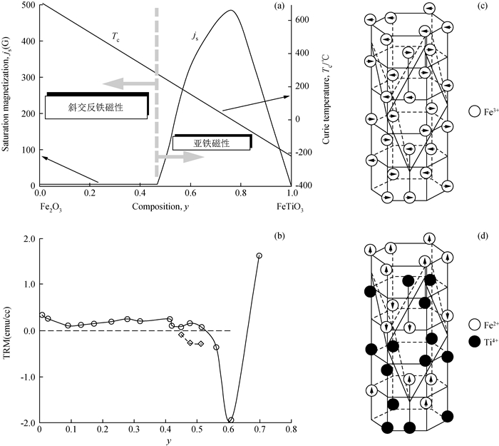 图2 实验室合成钛赤铁矿样品自反转研究案例(a)钛赤铁矿磁性质随Ti含量(y)的变化. Tc为居里温度,JS为饱和磁化强度(修改自Butler, 1992);(b)Ti含量为0.45~0.60的合成钛赤铁矿能够获得与实验室磁场方向相反的自反转热剩磁.“○”表示从合成温度1200 ℃冷却获得的TRM,“◇”表示从居里温度之上冷却获得的TRM(修改自Nagata and Uyeda, 1959);(c)赤铁矿和(d)钛铁矿在室温下的磁性结构(修改自Dunlop and Özdemir, 1997). Fig 2 Representative case studies of self-reversal in synthetic titanohematite samples (a) Ferromagnetic properties of titanohematite as a function of Ti content (y) (modified from Butler, 1992); (b) Synthetic titanohematite with Ti content of 0.45~0.60 could acquire self-reversed TRM opposite to the laboratory magnetic field direction. Open circles represent TRM obtained by cooling from the synthesis temperature of 1200 ℃, and open diamonds represent TRM obtained by cooling from above the Curie temperature (modified from Nagata and Uyeda, 1959); The magnetic structures of hematite (c) and ilmenite (d). |