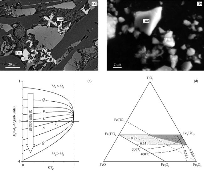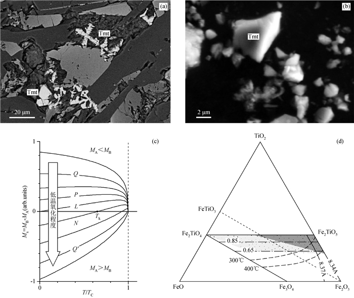 图4 钛磁铁矿单磁相自反转机制(a)西北太平洋玄武岩中原生钛磁铁矿(Tmt)和(b)北冰洋沉积物中碎屑钛磁铁矿(Tmt)的SEM背散射成像.晶体表面广泛发育的收缩裂纹表明其已普遍经历低温氧化;(c)Schult(1968)提出的饱和磁化强度随温度变化(MS-T)曲线类型随着低温氧化程度升高发生的转变. MA和MB分别为A、B亚晶格的磁化强度,T为绝对温度,Tc为居里温度,Tk为N型曲线的补偿温度(MA (Tk)=MB (Tk));(d)TiO2-FeO-Fe2O3三角图.浅灰色区域为Verhoogen(1962)提出的可能发生自反转的氧化钛磁铁矿组分域,深灰色区域为O'Reilly和Banerjee(1966)提出的自反转域.钛磁赤铁矿的晶格常数(a=8.37 Å和a=8.34 Å,实线)和居里温度(300 ℃和400 ℃,虚线)等值线根据Readman和O'Reilly(1972)绘制.点划线表示通过EDS测得的大洋玄武岩中钛磁赤铁矿颗粒的Ti含量(x)范围.(a, c, d)修改自Doubrovine和Tarduno(2004); (b)修改自 Channell和Xuan (2009). Fig 4 Hypothetical mechanism of single-phase self-reversal in titanomagnetites SEM backscatter imaging of (a) primary titanomagnetites (Tmt) in Northwest Pacific basalt and (b) detrital titanomagnetites (Tmt) in Arctic Ocean sediments; (c) Schult (1968) proposed the evolution of MS-T curve types with increasing oxidation. MA and MB represent A and B sublattice magnetizations, T is temperature, Tc is the Curie temperature, and Tk is the compensation temperature where MA (Tk)=MB (Tk) for N-type curves; (d) TiO2-FeO-Fe2O3 ternary diagram: Light gray area shows the region of oxidized titanomagnetite with possible self-reversal (Verhoogen, 1962). Smaller dark gray area shows the self-reversing region (O'Reilly and Banerjee, 1966). Contours of lattice parameter (a=8.37 Å and a=8.34 Å, solid lines) and Curie temperature (300 and 400 ℃, dashed lines) for titanomaghemite are from Readman and O'Reilly (1972). Dot-dashed lines show x values from EDS analysis of titanomaghemite from oceanic basalt. (a, c, d) modified from Doubrovine and Tarduno(2004); (b)modified from Channell and Xuan(2009). |