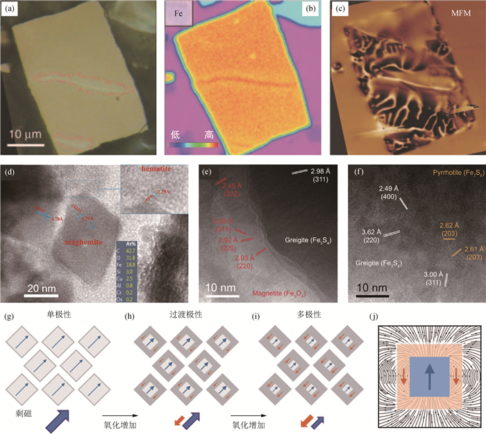 图6 多磁相颗粒自反转机制玄武岩样品中钛磁铁矿颗粒的(a)反射光显微照片、(b)Fe元素相对含量分布图和(c)磁力显微镜图像, 晶粒的磁畴结构明显受裂缝处成分变化的影响(修改自Krása et al., 2005);(d—f)透射电镜观测磁性矿物晶格条纹像.(d)磁赤铁矿颗粒边缘被氧化形成赤铁矿氧化壳(修改自Liu et al., 2022).胶黄铁矿颗粒部分氧化形成(e)磁铁矿氧化壳和(f)磁黄铁矿氧化壳;(g—j)Chang等(2023)提出的胶黄铁矿多相自反转CRM机制.胶黄铁矿部分氧化形成核壳结构,紧密接触的内核与氧化壳之间的磁相互作用导致自反转.(e—j)修改自Chang等(2023). Fig 6 Hypothetical mechanism of multi-phase self-reversal Reflected light micrograph (a), relative Fe content distribution (b) and magnetic force microscopic image (c) of a titanomagnetite grain from basalt sample. The domain configuration is clearly influenced by the compositional variations along the crack (modified from Krása et al., 2005); (d—f) Lattice fringe images of magnetic mineral particles observed by TEM. (d) Maghemite particles with oxidized rims forming hematite shells (modified from Liu et al., 2022). Greigite particles partially oxidized to form (e) magnetite or (f) pyrrhotite shells; (g—j) Multi-phase self-reversal CRM mechanism proposed by Chang et al. (2023) involving partial oxidation of greigite to form core-shell structures. The neoformed magnetite/pyrrhotite shell acquires a CRM coupled in the opposite direction to the primary CRM of the greigite core, likely through magnetostatic interactions or interfacial exchange interactions between the closely contacting core and shell.(e—j) modified from Chang et al., 2023. |