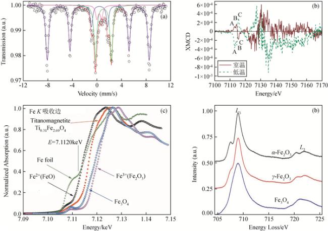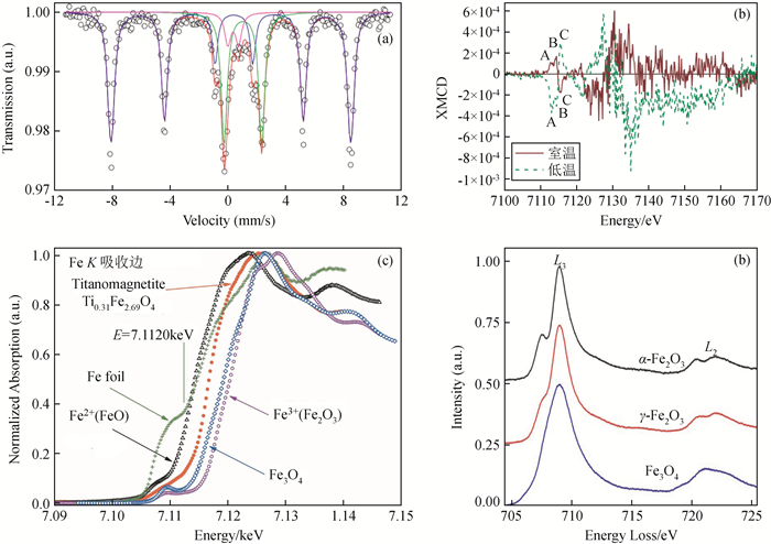 图8 磁性矿物氧化程度典型表征方法(a)玄武岩粉末在室温下的穆斯堡尔谱图:空心圆表示数据点,彩色线条表示最佳拟合曲线(红色)、赤铁矿(蓝色)、Fe2+(绿色)和Fe3+(品红色)(修改自Swanson-Hysell et al., 2011);(b)洋底玄武岩中钛磁赤铁矿在300 K(红色实线)和20 K(绿色虚线)下的XMCD谱图.20 K谱图是300 K谱图的反转,指示了剩磁的自反转.峰A、B、C分别位于7113.1、7114.4、7115.5 eV(修改自Carvallo et al., 2010);(c)钛磁铁矿(红色圆点)、铁箔(绿色十字)、FeO(黑色三角)、Fe3O4(蓝色矩形)和Fe2O3 (紫色圆点)的Fe K吸收边XANES谱图(修改自Okube et al., 2018);(d)Fe3O4(蓝色)、γ-Fe2O3(红色)和α-Fe2O3(黑色)的Fe 2p L2, 3边EELS谱图(修改自Almeida et al., 2014). Fig 8 Typical methods for characterizing the oxidation state of magnetic minerals (a) Room temperature Mössbauer spectra of basalt powder: open circles show measured data, colored lines represent the spectrum best fit (red), hematite (blue), Fe2+ (green) and Fe3+ (magenta) (modified from Swanson-Hysell et al., 2011); (b) XMCD spectra of ODP titanomaghemite sample at 300 K (red line) and 20 K (green dashed line). The 20 K spectrum is the reverse of the 300 K spectrum, indicating magnetization reversal. Peaks A, B, C at 7113.1, 7114.4, 7115.5 eV (modified from Carvallo et al., 2010); (c) XANES spectra near the Fe K edge for titanomagnetite (red circles), iron foil (green crosses), FeO (black triangles), Fe3O4 (blue rectangles), and Fe2O3 (purple circles) (modified from Okube et al., 2018); (d) EELS analysis of Fe 2p L2, 3 edge from pure Fe3O4 (blue), γ- Fe2O3 (red), and α- Fe2O3 (black) samples (modified from Almeida et al., 2014). |