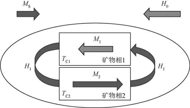 图5 两种磁性矿物相之间的磁相互作用引起自反转TRM机制模式图H0为外磁场,H1为矿物相1产生的退磁场,H1>H0. Tc1、Tc2、M1和M2分别为矿物相1和2的居里温度和热剩磁,Tc1>Tc2,M1<M2.总剩磁强度MS=M2-M1. Fig 5 Schematic diagram illustrating the hypothetical mechanism of self-reversed TRM due to magnetic interactions between two magnetic phases H0 represents the external magnetic field, H1 is the demagnetizing field produced by mineral phase 1, H1 > H0. Tc1, Tc2, M1, M2 are the Curie temperatures and TRMs of mineral phases 1 and 2, respectively, Tc1 > Tc2, M1 < M2. Total remanent magnetization MS=M2-M1. |