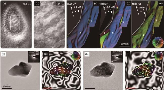 图7 透射电镜和电子全息成像技术典型研究案例(a,b)中等成分(y=0.7)钛赤铁矿的TEM暗场成像.样品在1300 ℃淬火并在650 ℃退火10 h后形成富Ti相和贫Ti相微观结构(修改自Harrison, 2006);(c—e)钛赤铁矿(y=0.7)样品相邻磁畴中磁通量的电子全息成像.灰线表示样品边缘.样品首先暴露在+1000 mT磁场下,然后分别施加(c)-1.9 mT、(d)-10.6 mT和(e)-12.8 mT的小磁场.白色箭头表示外加磁场的方向.颜色表示磁通量的方向和强度.蓝紫色和绿黄色表示相反的面内磁化方向.深色条纹为磁畴壁.“1”和“2”是180°磁畴壁和化学壁;“3”是0°磁畴壁(修改自Harrison et al., 2005);(f, h)拉长的磁铁矿颗粒在700 ℃下9 mbar氧气中原位加热8 h前后的TEM亮场成像.插图为对应的选区电子衍射(SAED)图,标定为Fe3O4;(g, i)电子全息成像重建样品加热前后的磁感应图,显示准单畴(pseudo-single domain, PSD)性质.等高线间距为0.20弧度.磁化方向由箭头表示.(f—i)修改自Almeida等(2014). Fig 7 Typical case studies of TEM and electron holography imaging techniques (a, b) Dark-field TEM images of the fine structure of closely contacting Ti-rich and Ti-poor phases in titanohematite (y=0.7), quenched from 1300 ℃ and annealed at 650 ℃ for 10 h (modified from Harrison, 2006); (c—e) Electron holography images showing magnetic flux in adjacent magnetic domains of titanohematite (y=0.7). Gray lines mark sample edges. The sample was first exposed to a +1000 mT field, then to a smaller field of (c) -1.9 mT, (d) -10.6 mT, (e) -12.8 mT. White arrows show the direction of the applied field. Colors indicate the direction and strength of the magnetic flux, defined by the color wheel. Blue-purple and green-yellow indicate opposite in-plane magnetizations. Dark bands are magnetic domain walls. "1" and "2" are 180° magnetic and chemical walls; "3" are 0° magnetic walls (modified from Harrison et al., 2005); (f, h) Bright-field TEM images of an elongated magnetite particle (f) before and (h) after in situ heating to 700 ℃ under 9 mbar of O2 for 8 h, with corresponding SAED patterns (inset) indexed to Fe3O4; (g, i) Magnetic induction maps from phase shift holograms (g) before and (i) after heating, showing the particle's PSD nature. Contour spacing is 0.20 radians. Magnetization direction is indicated by arrows, as shown in the color wheel. (f-i) modified from Almeida et al., 2014. |