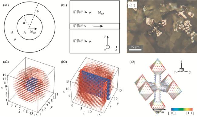 图9 磁性矿物的微磁建模和计算得到的磁畴结构(a1)球体A(剩磁MRA)被球壳B(磁导率μ)包裹的双相模型;(a2)球形双相颗粒的磁化结构;(b1)薄板状矿物相A(x-z平面)位于矩形矿物相B内的双相模型;(b2)矩形双相颗粒的磁化结构.相A的磁化矢量用蓝色表示,相B的磁化矢量用红色表示,外加磁场沿x轴方向(a-b修改自Krása et al., 2005);(c1)深海大洋玄武岩快速冷却形成的骨架状/树枝状钛磁铁矿颗粒;(c2)树枝状颗粒的微磁结构和磁化结果.蓝色到红色表示磁化矢量方向从[100]方向变化到[111]方向.(c1,c2)修改自葛坤朋和刘青松(2018). Fig 9 Micromagnetic modeling and calculated domain structures for magnetic grains (a1) Two-phase model of a sphere A with remanent magnetization MRA(T) surrounded by a spherical shell B with permeability μ; (a2) Magnetization structure of the spherical two-phase grain; (b1) Two-phase model of a thin plate A in the x-z plane within a rectangular grain B; (b2) Magnetization structure of the rectangular two-phase grain. Magnetization vectors of phase A are shown in blue, phase B in red, with the external field along the x-axis (a-b modified from Krása et al., 2005); (c1) Skeletal (dendritic) titanomagnetite grains formed in supercooling oceanic basalt; (c2) Micromagnetic structure and magnetization result of a dendrite. Color transition from blue to red indicates the change in magnetization vector direction from [100] to [111].(c1, c2) modified from Ge and Liu, 2018. |